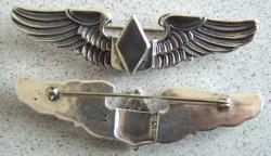 This is a museum quality museum quality reproduction of the WASP Class W-8 Wing in sterling silver. This class was due to receive the new Josten WASP wing but they did not arrive in time, so they got a modified, cut off AMICO pilot wings with a diamond shaped center. This was the first wing presented with this diamond center. For more information and to see a picture of the original go to page 351 of More Silevr Wings, Pinks & Greens by Jon Maguire.